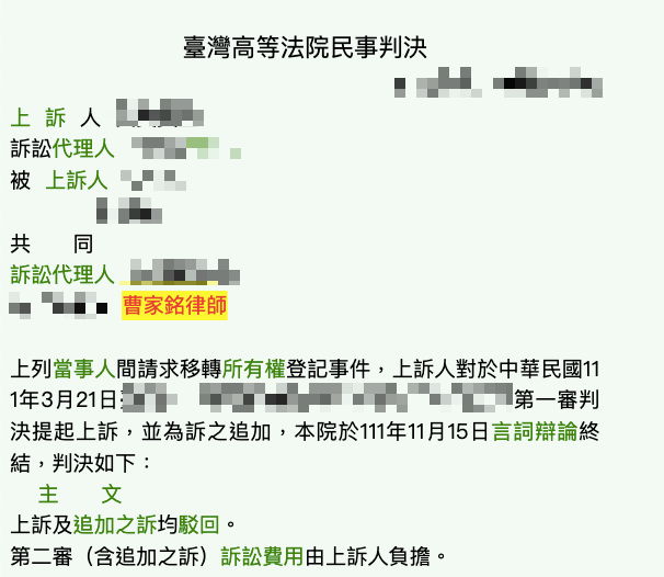 被訴請求移轉所有權登記,成功獲得勝訴